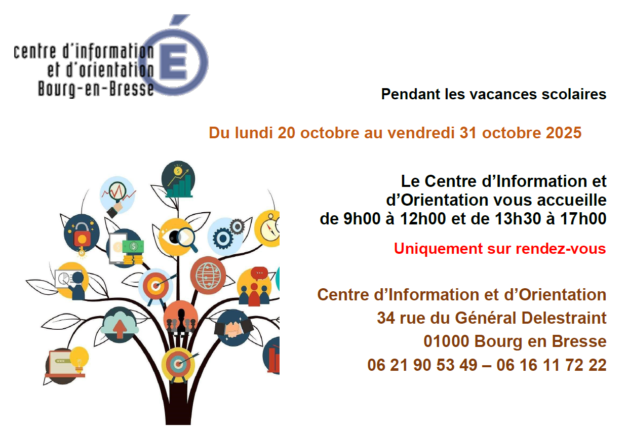 Ouverture du CIO de BOURG EN BRESSE Pendant les vacances d'automne 25. Vous pouvez prendre rendez vous en téléphonant aux numéros provisoires du CIO : 06 21 90 53 49 / 06 16 11 72 22